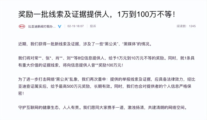 2025年初,比亚迪已对15位提供黑公关相关线索及证据的举报人给予了1万至30万元不等的奖励,并对其中一位提供重大价值证据的举报人奖励高达100万元。