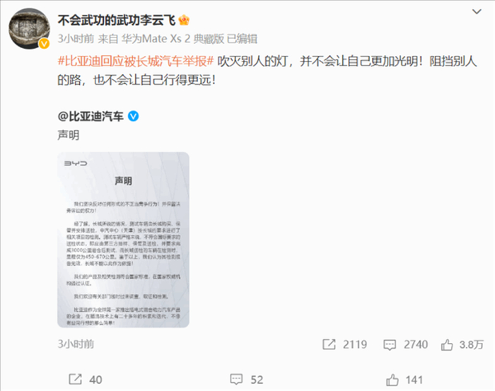 比亚迪公关总经理李云飞曾回应写道:“吹灭别人的灯,并不会让自己更加光明;阻挡别人的路,也不会让自己行得更远!”