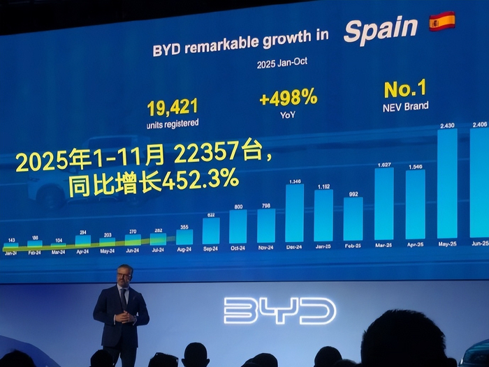 在西班牙,比亚迪1-11月累计销量为22358辆,同比增长452.3%;11月销量为2934辆,同比增长267.7%,一举超越特斯拉,首次登上电动车月销量榜首。