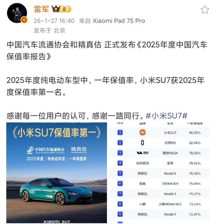 今天,雷军再次回应小米SU7的保值率,中国汽车流通协会最新发布的报告,再次证明了小米SU7保值率第一的事实。