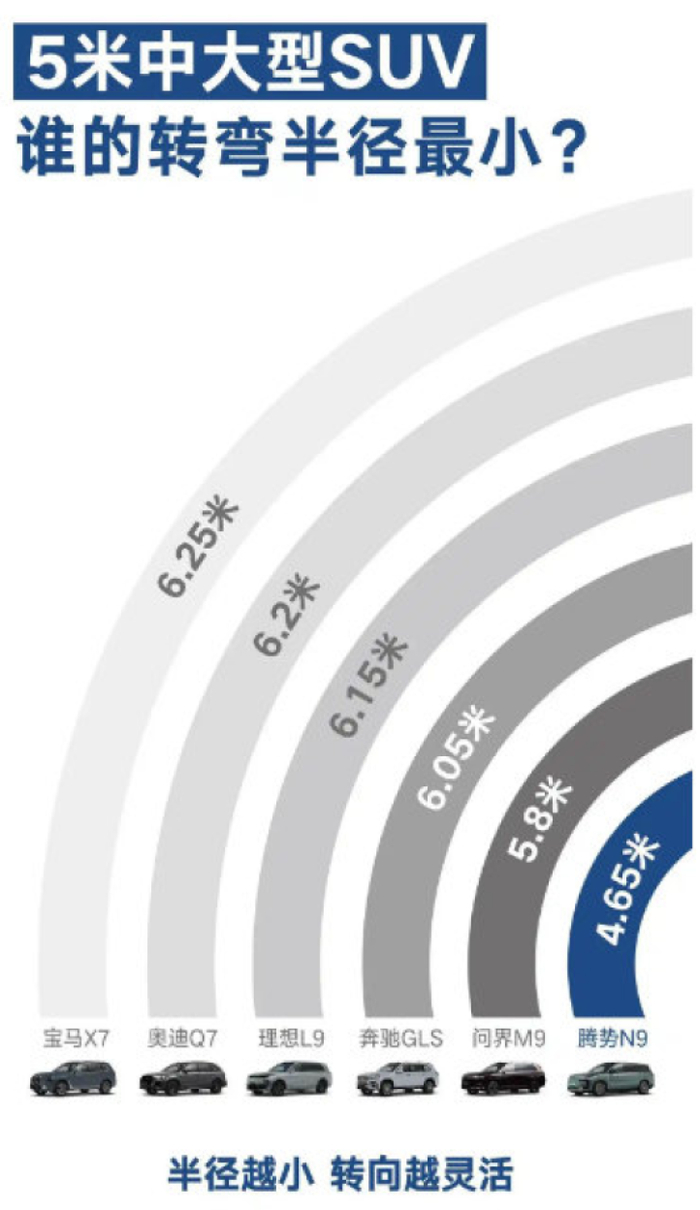 这意味着如果在两车道路段,其他大型SUV至少需要倒车一次才能完成掉头,而腾势N9则可以像小型车一样轻松应对。