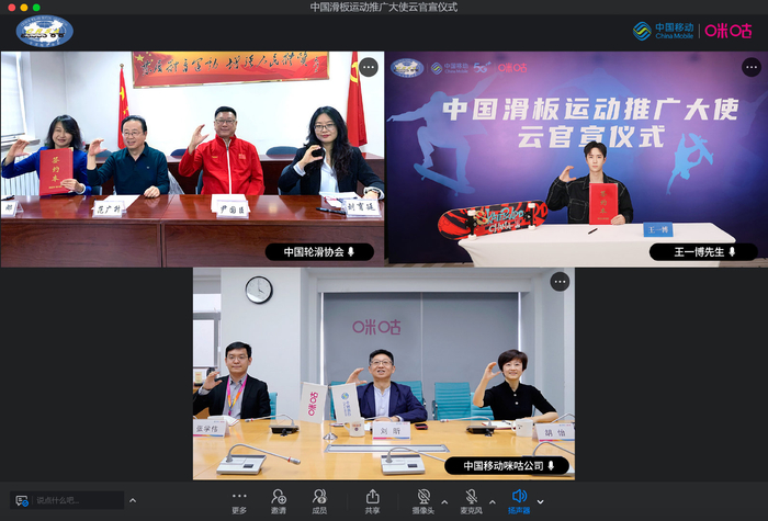签约后进行了充满纪念意义的云合影。随着王⼀博担任“中国滑板运动推广大使”的正式官宣,2020全国滑板锦标赛及“滑板之王”线上赛也将拉开帷幕,目前,2020全国滑板锦标赛正在积极筹办中,该赛事拟由国家体育总局社会体育指导中心、中国轮滑协会、江苏省体育局共同主办,中国移动咪咕公司作为战略合作伙伴,将对赛事进行全程直播,这将是今年在国内举办的首场奥运积分赛,万众瞩目!