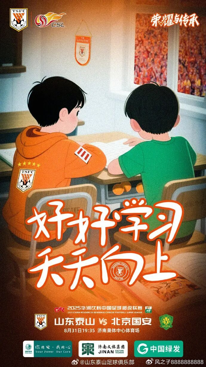 泰山队上一场战胜西海岸,收获3连胜,韩鹏执教渐入佳境。克雷桑打破进球荒,瓦科也延续着极其出色的状态。国安此前也是3连胜状态正佳,目前他们距离榜首的申花只差1分,仍有争冠希望。赛前泰山队发布了本场比赛的战前海报,主题是“好好学习,天天向上”,细节满满。