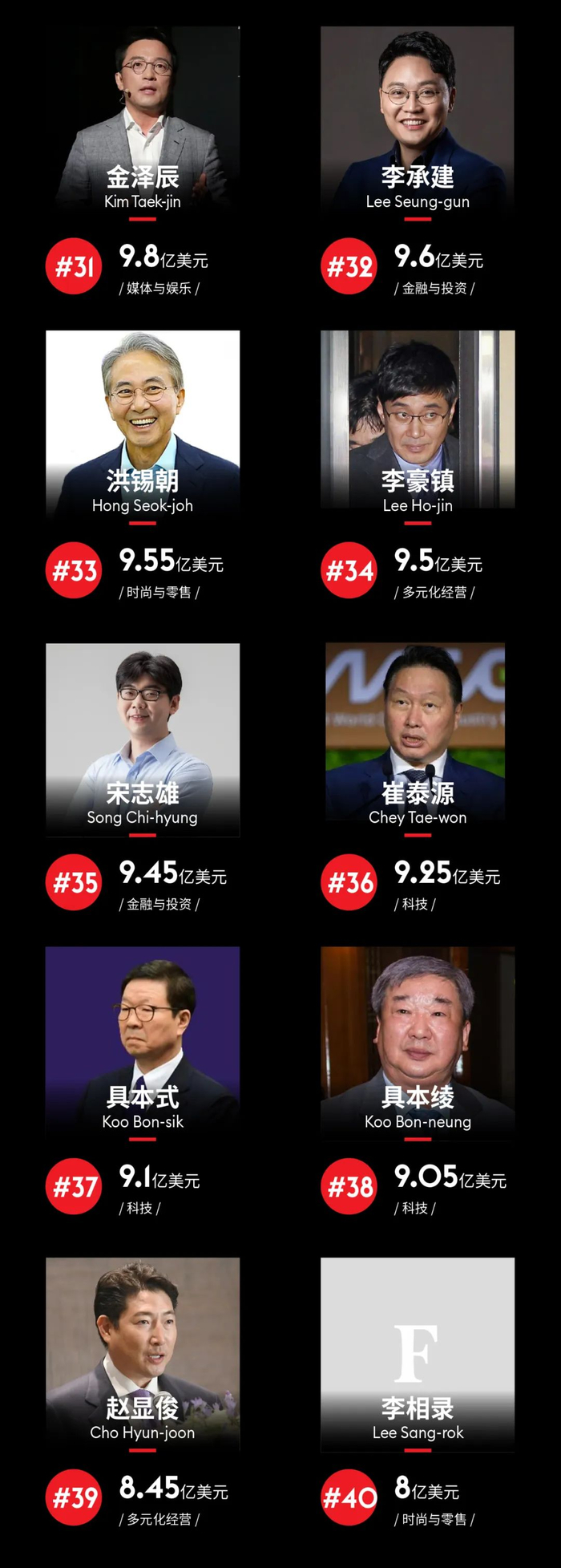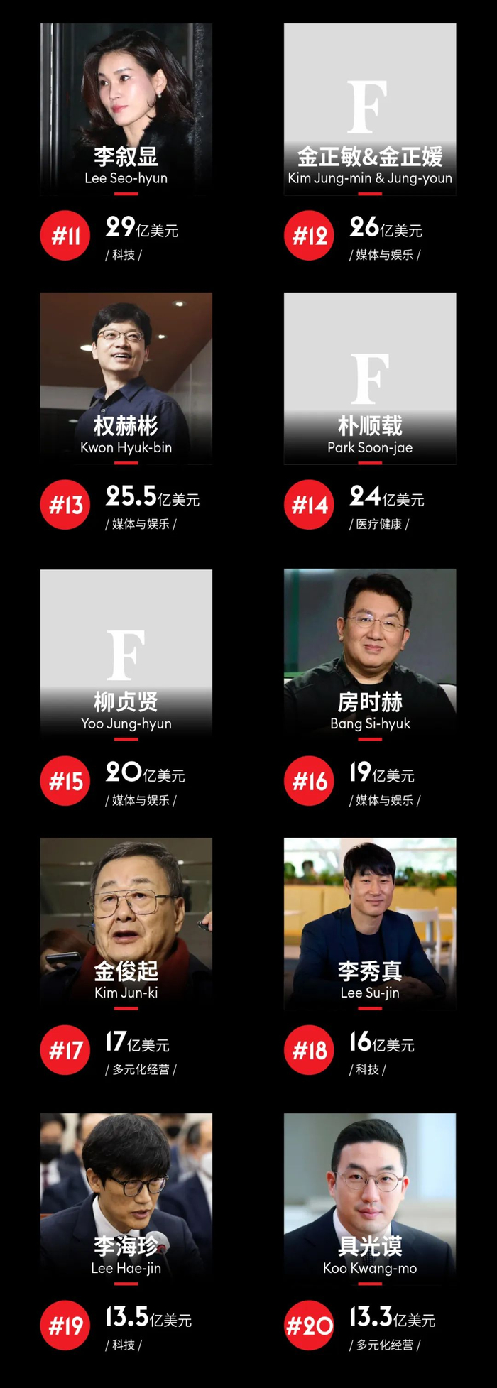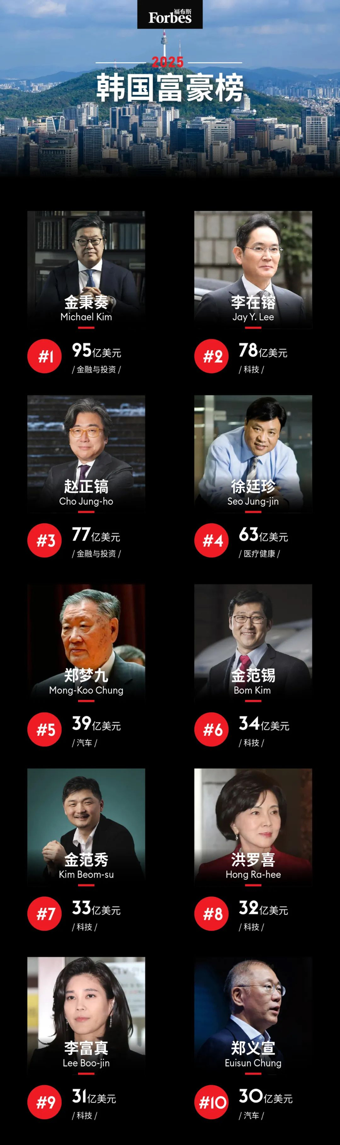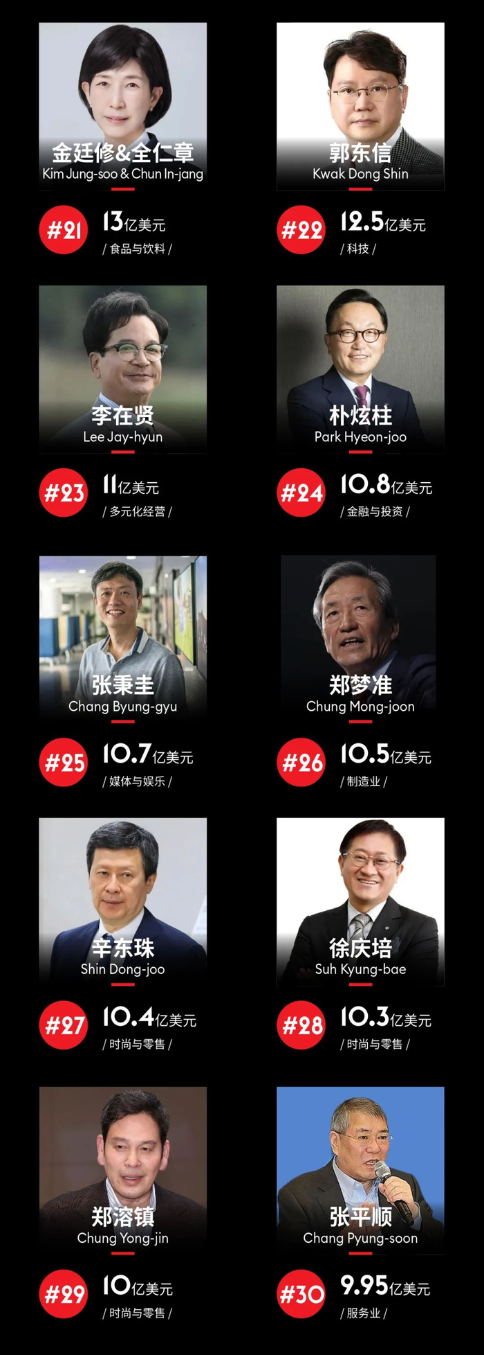 本榜单是根据从家庭和个人、证券交易所、年报、分析师、政府机构及其他渠道获取的持股和财务信息编制而成。富豪们的财富估值是根据截至2025年4月7日收盘时的股价和汇率计算得出,可能与福布斯官网(Forbes.com)的实时富豪榜数据有所出入。非上市公司的估值是基于相似上市公司的交易信息。榜单反映了个人财富和家庭财富,包括亲属共享的财富,因此可能与福布斯全球亿万富豪榜上的数据有所不同,后者的身家数据截至3月7日。榜单还可能包括与韩国有业务、居住或其他关联的外国公民,或者不居住在韩国但与该国有重要业务或其他联系的本国公民。编辑保留根据新信息修改任何信息或删除任何上榜者的权利。