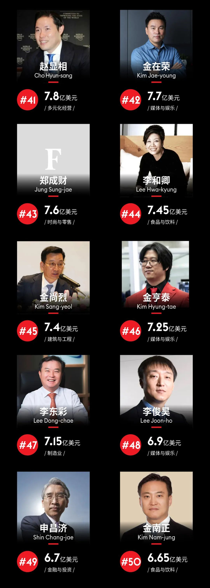今年有三位新面孔上榜:三养食品(Samyang Foods)背后的夫妻档金廷修和全仁章,他们研发的辣味火鸡面畅销海外,二人的财富也水涨船高;网络游戏开发公司Shift Up的创始人金亨泰(Kim Hyung-tae),去年完成韩国第二大上市融资(融资金额达3.2亿美元)后跻身富豪之列;还有医美器械公司Classys创始人郑成财(Jung Sung-jae),由于韩流美容热潮持续升温,该公司股价飙升50%。