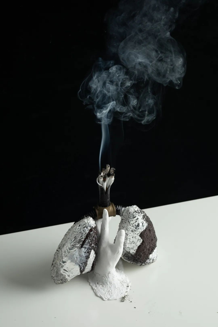 另一个作品是递交给“2024福布斯中国青少年艺术家100人大赛”评审的3D装置作品:一对被香烟侵蚀的“肺”,装置结构使用粘土、锡箔纸、石英砂与白乳胶组合,模拟出器官逐渐崩解的质感。“我小时候看到很多公益广告在讲抽烟危害,但视觉冲击都不够。我的作品是想让人不适——不适才会让人记住。”他解释说。这组作品是他探索“青少年自我认知与风险警示”主题的系列之一,亦体现出他早期将公共议题转化为创作语言的能力。