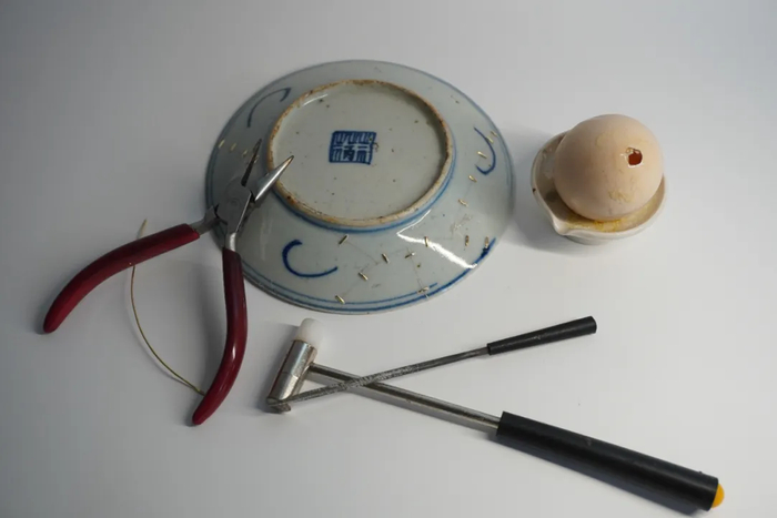 她女儿开车带她来杨瑞琦的工作室,老奶奶就在旁边看着杨瑞琦修,先把裂开的瓷片捆在一起,再把金属锔子用合适的力度打进去,重一分力轻一分力都不行。“没有金刚钻,别揽瓷器活。”最早形容的就是锔瓷这门手艺。