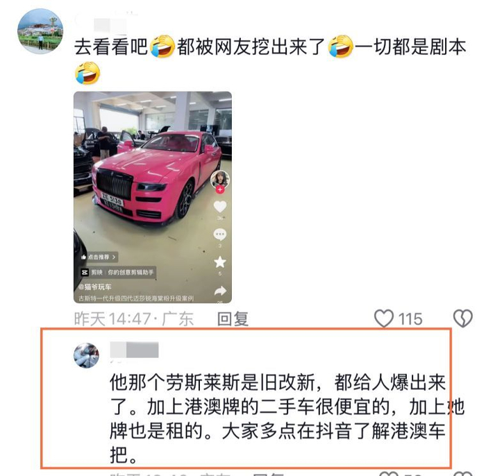 接着,朱根菜的劳斯莱斯豪车资料也被扒出来,网友发现她其中一个牌照是两个月前刚租的,还有帮她改车的师傅也晒出了这辆车之前的照片。