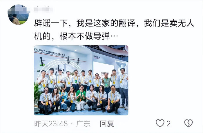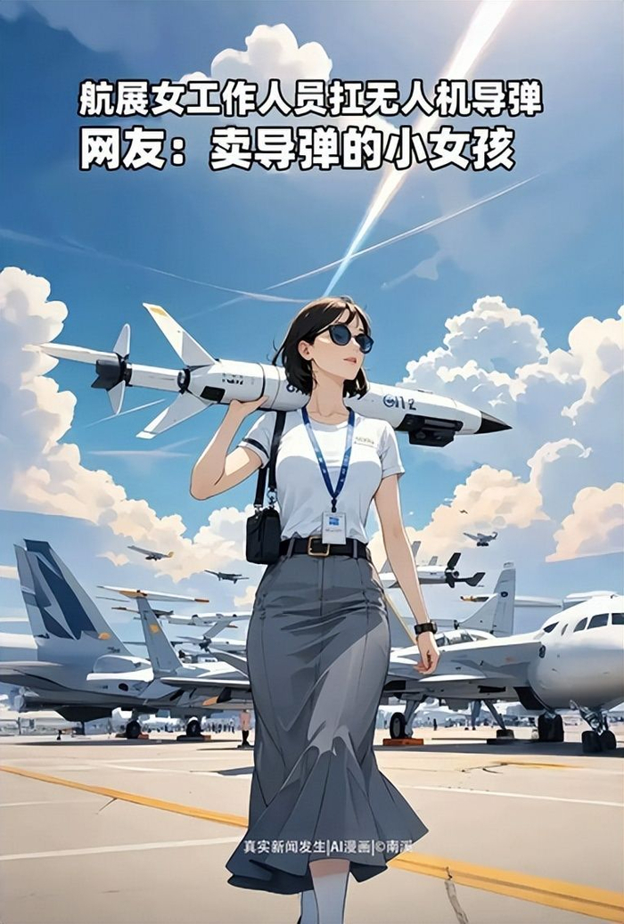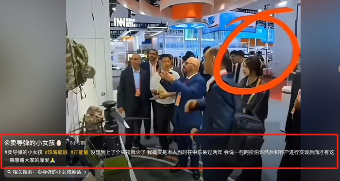 很快,这名女生把网名改为“卖导弹的小女孩”,还转发了视频,看得出能为航展出一份力她很自豪。但随后她的同事晒照回应,表示小女孩并不是导弹展柜的销售,只是恰好在那帮了一下忙,她只是翻译,而且她的无人机公司的。
