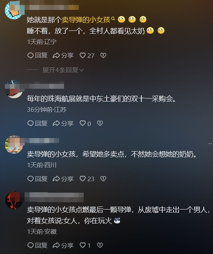 很快这个小女孩就在网上爆火,大家对她的身份十分好奇,还很热心的给她取了个雅称“卖导弹的小女孩”,甚至给她编了很多故事,互动很有趣。
