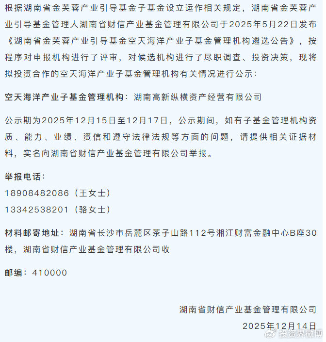 投资界(ID:pedaily2012)12月15日消息,根据湖南省金芙蓉产业引导基金子基金设立运作相关规定,湖南省金芙蓉产业引导基金管理人湖南省财信产业基金管理有限公司于2025年5月22日发布《湖南省金芙蓉产业引导基金空天海洋产业子基金管理机构遴选公告》,按程序对申报机构进行了评审,对候选机构进行了尽职调查、投资决策,现将拟投资合作的空天海洋产业子基金管理机构有关情况进行公示,子基金管理机构为湖南高新纵横资产经营有限公司。