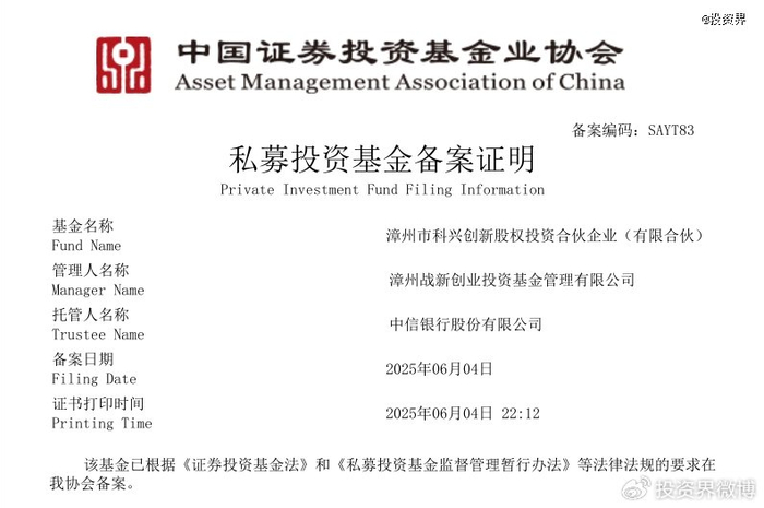 投资界(ID:pedaily2012)6月11日消息,近日,漳州市市级“拨改投”基金——漳州市科兴创新股权投资合伙企业(有限合伙)(以下简称“科兴创新基金”)正式完成中国证券投资基金业协会基金产品备案登记。