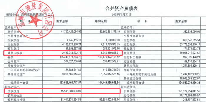 而不一般的是,今年上半年,深铁的债权投资却突然出现了155亿。根据年报信息显示,该科目在2023年末和2024年末均为零,2023年末仅为16亿。对于这突然出现的155亿债权投资,占到净资产的5%,公司中报并未给出解释。
