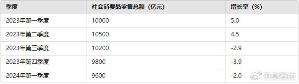 从以上数据可以看出,社会消费品零售总额自2023年第二季度达到高峰后开始下滑,增速也由正转负。2024年第一季度的数据更是显示出社会消费品零售总额继续下降,表明消费市场尚未企稳。