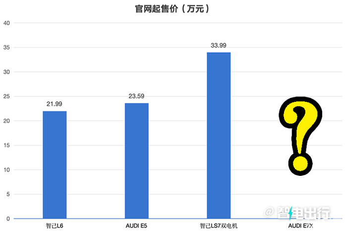 重点来了——价格!智己L6的官方指导价21.99万起,奥迪E5 SPORTBACK起售价23.59万,价差1.6万。智己LS7在售车型只有双电机版,指导价33.99万,保守估计E7X的4座顶配价格大概率在36万左右,入门配置预计售价在30万以下。