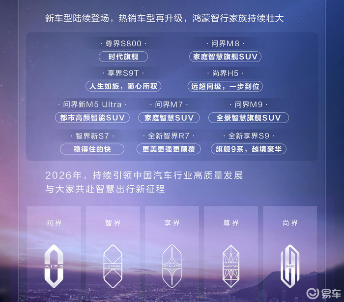 华为终端BG董事长余承东表示:2026年五界的产品矩阵会补齐,有SUV、轿车、还有MPV。另据全球知名金融机构高盛预测:2026年问界销量将增长43%,超60万辆。
