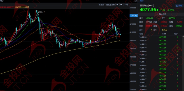 上周五,现货黄金一度触及 4211.06 美元高位,随后大幅回落,一度下跌至 4032.10 美元低点。在经过上周四和上周五大跌之后,上周金价涨幅缩减至2.1%。今日欧市盘中,黄金延续跌势,目前在4077美元附近徘徊。