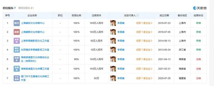 天眼查App显示,李易峰共关联7家企业,其中4家为存续状态,包括上海峰岩文化传媒中心、上海峰路文化传媒中心、上海李易峰影视文化工作室、东阳横店李易峰影视工作室,上述4家企业均为李易峰个人独资。