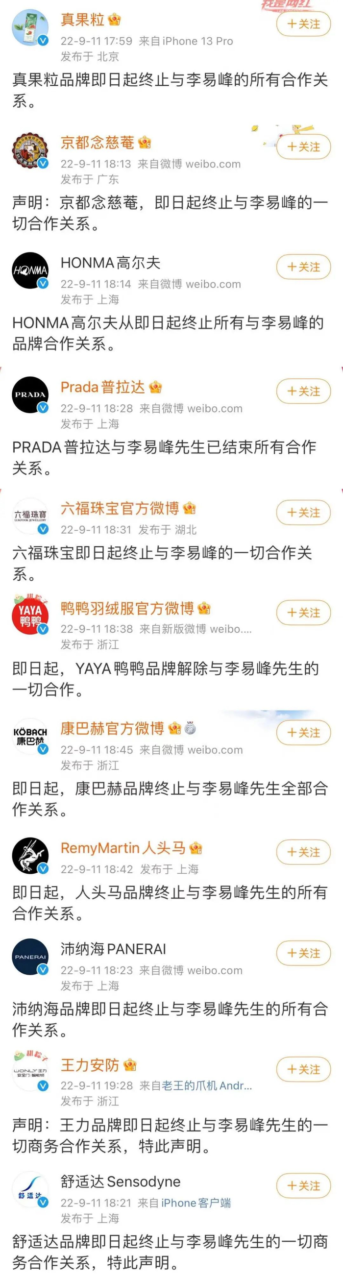 截至发稿时,已有十余个品牌宣布终止与李易峰的合作。
