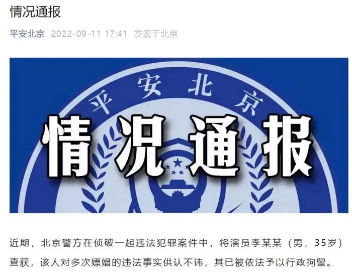 9月11日,平安北京微信公众号发布警情通报:近期,北京警方在侦破一起违法犯罪案件中,将演员李某某(男,35岁)查获,该人对多次嫖娼的违法事实供认不讳,其已被依法予以行政拘留。