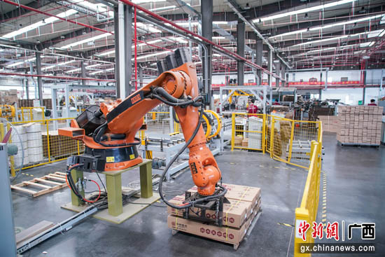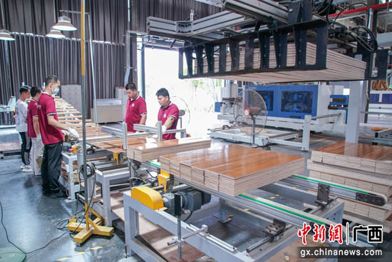 7月7日,广西贵港市港南区一家木材加工企业内,机械化流水线自动包装板材。陈冠言 摄