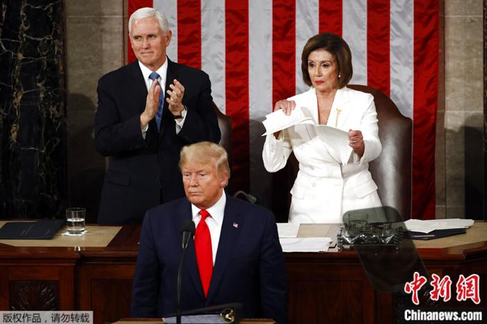 资料图:2020年2月4日,美国华盛顿举行的国会联席会议上,众议长佩洛西撕毁了时任总统特朗普的国情咨文副本。