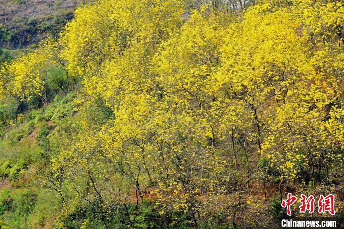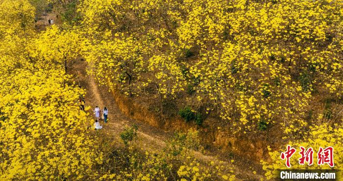 盛放的黄花风铃木,远眺如缠绕在山间的金色“巨龙”。 廖源 摄连日来,广西玉林市陆川县米场镇新民村百余亩连片黄花风铃木竞相开放,形成一片金灿灿的花海,吸引游客前往观赏。怒放的金黄色花朵迎风摇曳,如一串串“风铃”随风起舞,美不胜收,构成了一幅生机勃勃的春日图景。