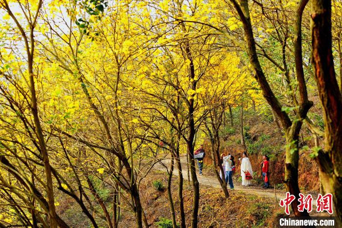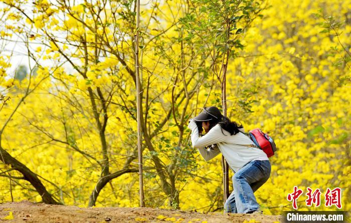 黄花风铃木迎春绽放,吸引游人前来观赏。 廖源 摄