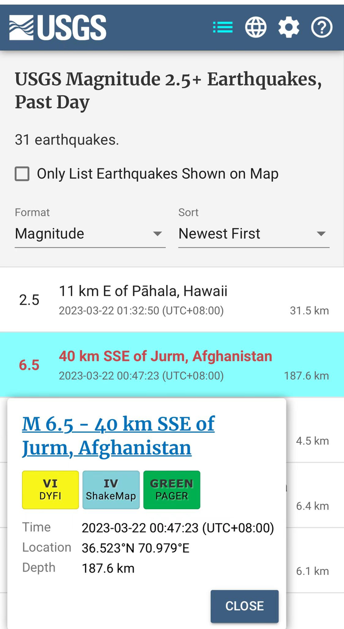 图片来源:美国地质勘探局网站截图中新网3月22日电 据美国有线电视新闻网(CNN)报道,美国地质勘探局消息显示,阿富汗发生里氏6.5级地震,阿富汗及邻国巴基斯坦均有震感。