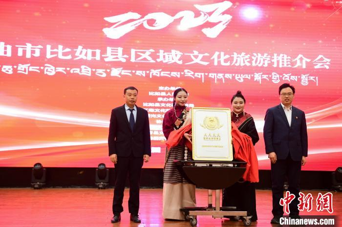 图为比如县唐蕃古道文化旅游景区国家AAAA级旅游景区揭牌仪式现场。 贡嘎来松 摄随后,比如、索县、巴青、嘉黎四县代表娓娓而谈,通过文旅资源推介向大家展现了不同县区别样的自然风光与人文风采。此外,会上还举办了比如唐蕃古道文化旅游景区国家AAAA级旅游景区揭牌仪式,进行了比如特色文旅产品展示,比如县民族艺术团带来了精彩的非遗歌舞展演。