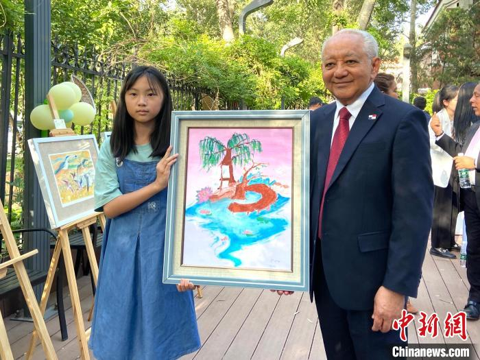 巴拿马驻华大使甘林(右)与马瑞萱及其作品《运河之夏》合影留念。 肖玉笛 摄10岁的马瑞萱画了一幅《运河之夏》。“这是柳树,代表着夏天的清凉。这是荷花,是夏天的代表之花。”她用粉、绿、蓝等色彩描绘京杭大运河的夏季景色。