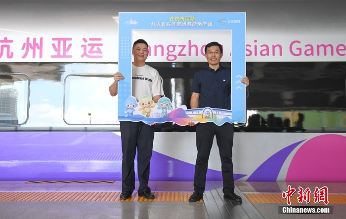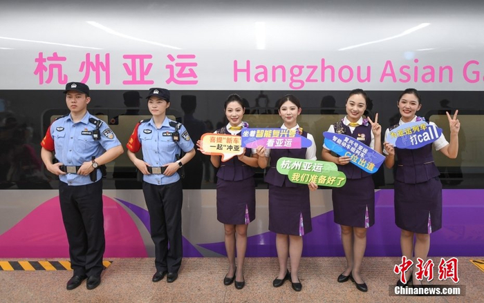 8月4日,浙江杭州,乘警和乘务员在亚运列车外合影。当日,杭州第19届亚运会迎来倒计时50天,专为杭州亚运会打造的复兴号亚运智能动车组列车迎来首次试乘体验活动。按照亚运服务保障计划,该亚运列车后期将安排在浙江省内高铁线路上运行。中新社记者 王刚 摄