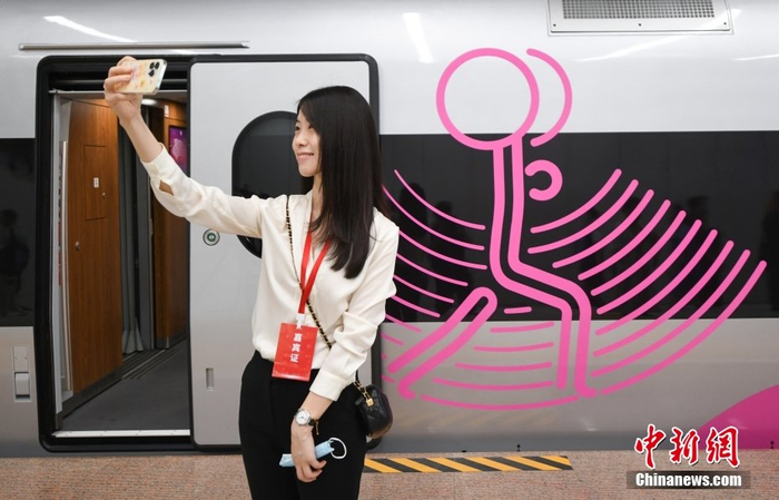 8月4日,浙江杭州,乘客“打卡”亚运列车。当日,杭州第19届亚运会迎来倒计时50天,专为杭州亚运会打造的复兴号亚运智能动车组列车迎来首次试乘体验活动。按照亚运服务保障计划,该亚运列车后期将安排在浙江省内高铁线路上运行。中新社记者 王刚 摄