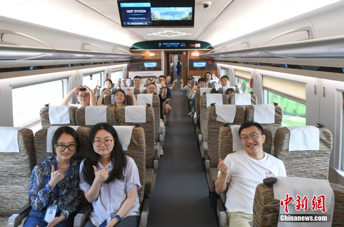8月4日,浙江杭州,乘客体验亚运列车,该列车配备5G无线网络以及车内气压与温度自动调节系统。当日,杭州第19届亚运会迎来倒计时50天,专为杭州亚运会打造的复兴号亚运智能动车组列车迎来首次试乘体验活动。按照亚运服务保障计划,该亚运列车后期将安排在浙江省内高铁线路上运行。中新社记者 王刚 摄