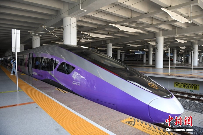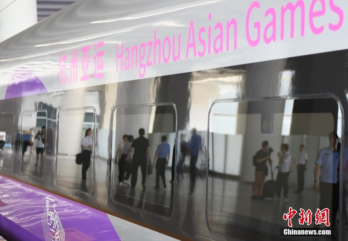 8月4日,浙江杭州,亚运列车停靠在杭州西站。当日,杭州第19届亚运会迎来倒计时50天,专为杭州亚运会打造的复兴号亚运智能动车组列车迎来首次试乘体验活动。按照亚运服务保障计划,该亚运列车后期将安排在浙江省内高铁线路上运行。中新社记者 王刚 摄