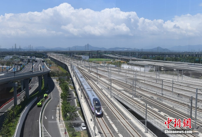 8月4日,浙江杭州,亚运列车驶入杭州西站。当日,杭州第19届亚运会迎来倒计时50天,专为杭州亚运会打造的复兴号亚运智能动车组列车迎来首次试乘体验活动。按照亚运服务保障计划,该亚运列车后期将安排在浙江省内高铁线路上运行。中新社记者 王刚 摄