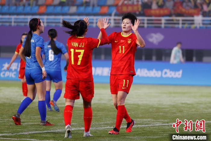 9月22日,在杭州临平体育中心体育场举行的亚运会女足小组赛中,中国女足队长王珊珊(身穿11号球衣者)进球后与队友庆祝。中新社记者 殷立勤 摄
