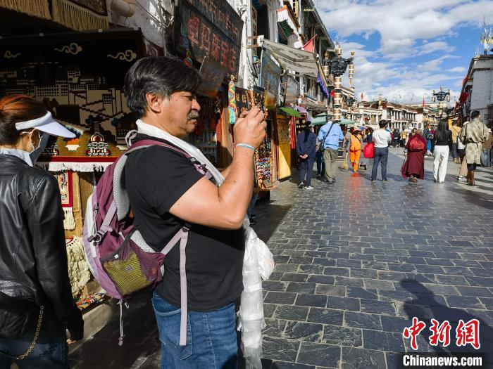 9月19日,阿根廷资深媒体人、作家伍志伟(Gustavo Emilio Ng)参观拉萨八廓街。中新社记者 赵延 摄伍志伟说:“之前,西方世界说西藏不能够容忍宗教,但我看到的现象却是恰恰相反。”他认为,宗教是社会生活和文化的一部分,应该始终受到尊重,“在这里,我感受到人们尊重自己的生活方式,官方亦如此。”