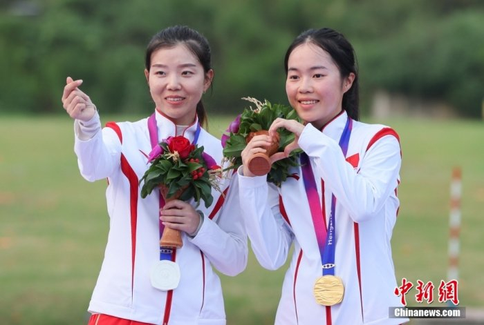 9月27日,杭州第19届亚运会射击女子双向飞碟个人决赛在富阳银湖体育中心举行。中国选手江伊婷(右)以57的总分打破亚运会纪录,夺得金牌,中国选手高金梅(左)以55的总分获得银牌。中新社记者 贾天勇 摄