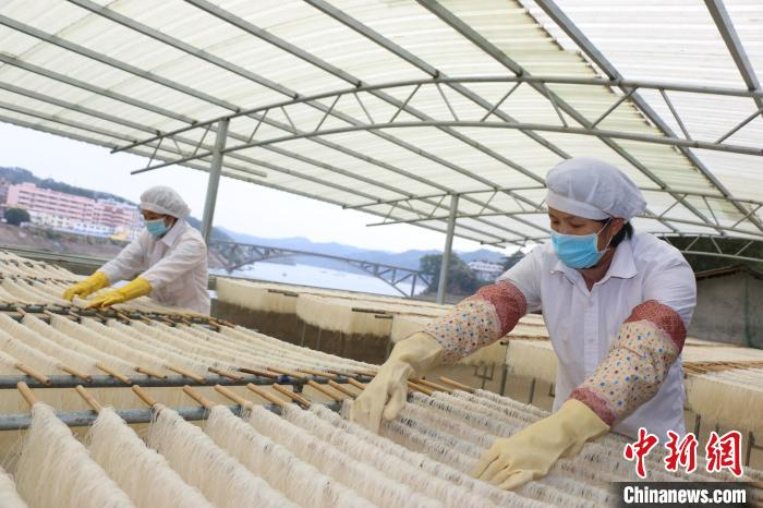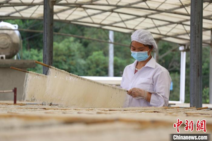 2021年5月14日,广西京南米粉食品科技有限公司工人正在晾晒京南米粉。 廖伟 摄“传统手工艺制作的京南米粉色泽光亮、柔韧耐煮、细滑爽口、口感鲜美。”罗年介绍,京南米粉以当地每年新收的早稻米和高山泉水为原料纯手工制作,需要经过磨浆、蒸粉、晾晒等十余道工序。因其独特口感、优质原料和地域特色,产品在粤港澳及东盟市场,广受消费者青睐。
