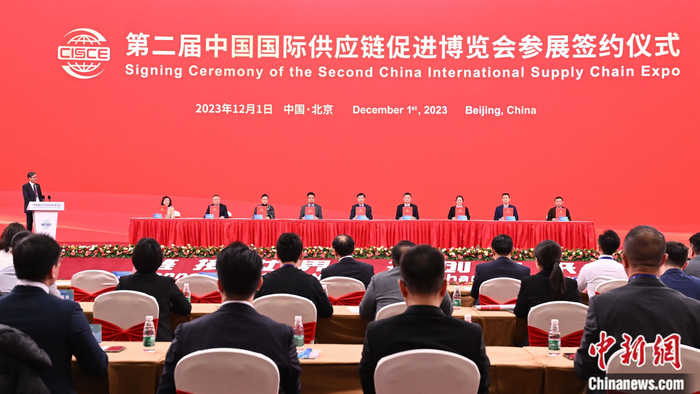 12月1日下午,第二届中国国际供应链促进博览会参展签约仪式在中国国际展览中心顺义馆举行。中新网记者 李骏 摄链博会作为全球首个以供应链为主题的国家级展会,首届链博会展览总面积达到10万平方米,515家中外企业和机构参展,其中来自国外的参展商占比达到26%,规模盛大,参与广泛。