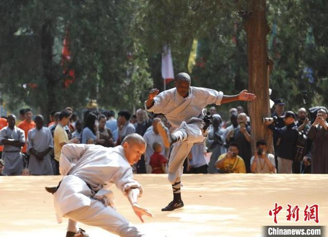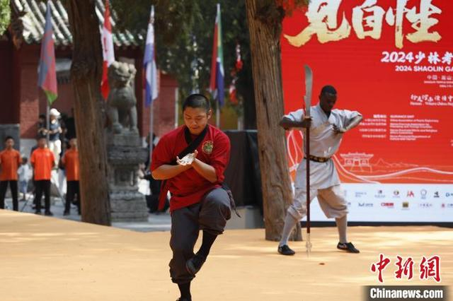 7月14日,2024少林考功总决赛继续在中国嵩山少林寺举行。13日以来,来自47个国家和地区的逾百位少林功夫习练者在此展开比拼,争夺“2024世界少林功夫之星”。以“千年传承,历久弥新;少林文化,人类共享”为主题的是次大赛由少林寺主办。图为中外选手同台竞技。中新社记者 阚力 摄