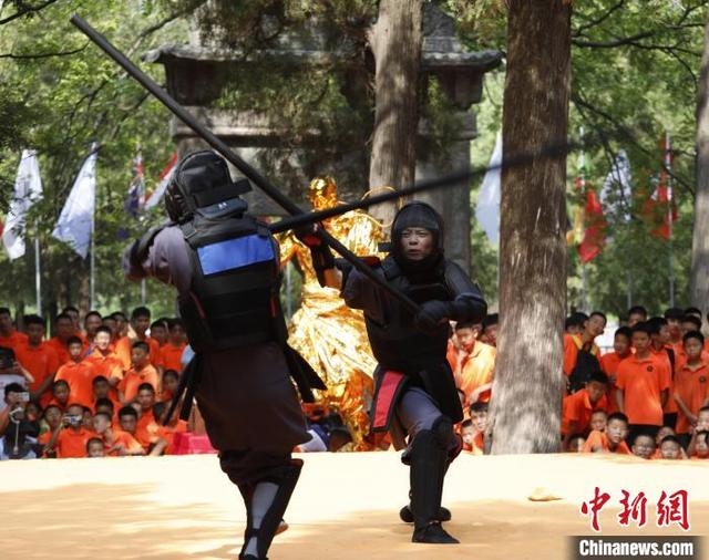 7月14日,2024少林考功总决赛继续在中国嵩山少林寺举行。13日以来,来自47个国家和地区的逾百位少林功夫习练者在此展开比拼,争夺“2024世界少林功夫之星”。以“千年传承,历久弥新;少林文化,人类共享”为主题的是次大赛由少林寺主办。图为比赛间隙武僧展演少林长棍对抗。中新社记者 阚力 摄