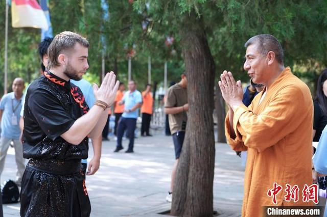 7月14日,河南登封,2024少林考功总决赛继续在中国嵩山少林寺举行。海内外的少林功夫习练者,除在台上激烈比拼,台下热身备赛等也精彩不断。图为少林“洋弟子”相互交流。中新社记者 李超庆 摄