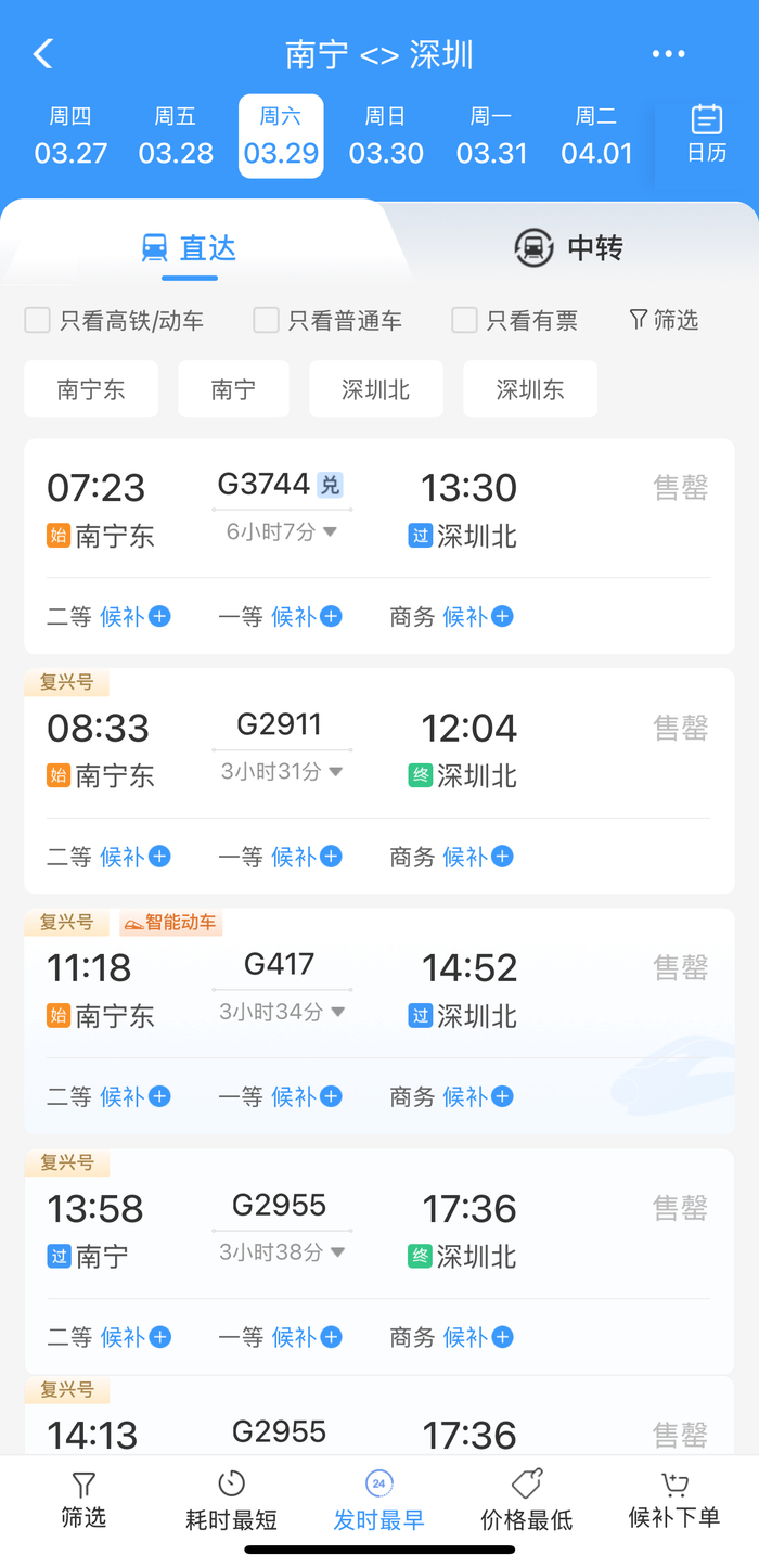 3月29日,南宁往深圳方向的高铁、动车票已全部售罄。