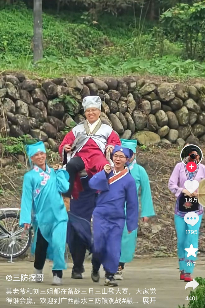 有网友拍摄到,今年三月三,广西融水三防镇的“莫老爷团队”全员Cosplay,力求还原电影《刘三姐》名场面。