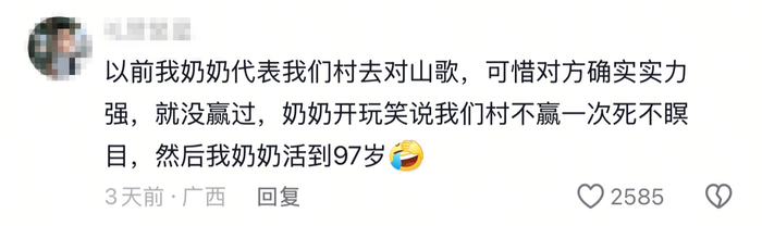 网友评论截图。别不信,评论区里一名广西网友力证:“以前我奶奶代表我们村去对山歌,可惜对方确实实力强,就没赢过,奶奶开玩笑说我们村不赢一次死不瞑目,然后我奶奶活到97岁。”