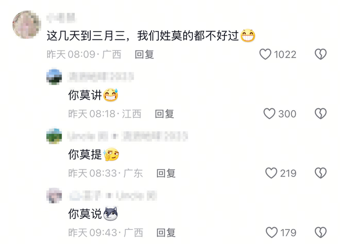 有网友表示:这几天一直到三月三,我们姓莫的都不好过。