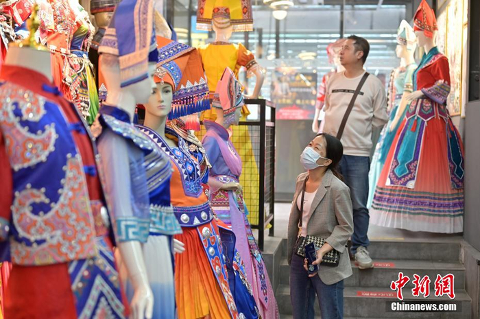 资料图为广西南宁市民挑选各色民族服饰。如果细心留意南宁的部分商场及服装店,你会发现进入3月以后,各类民族服饰已经牢牢占据“C位”,没办法谁叫民族服饰卖得火爆,“销冠”排场足一些很正常。