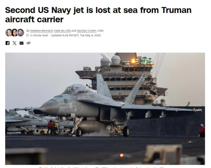 中新网5月7日电 据美国有线电视新闻网(CNN)当地时间6日报道,多位知情人士透露称,美国“哈里·杜鲁门”号航空母舰又一架F/A-18战机在红海坠落,这是该航母在一周多时间内损失的第二架战机。